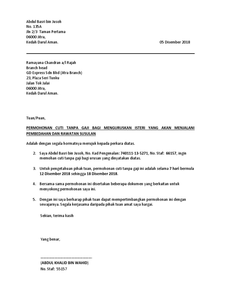 Contoh Surat Cuti Kerja Tanpa Ganji Sebab Kecemasan Sakit Atau Alasan Peribadi Career Resources